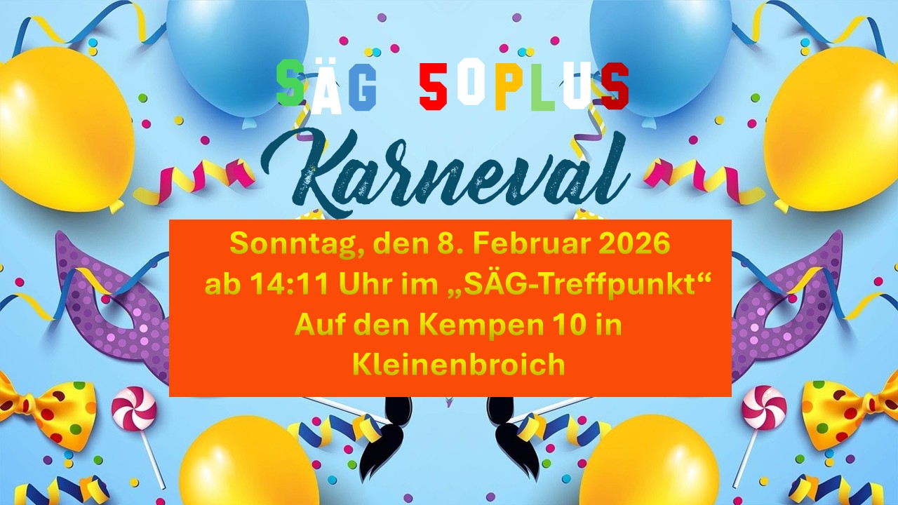 Unter dem Motto „Singen, lachen, tanzen für alle“ sind alle Karnevalsjecken zum Feiern am Sonntag, den 08.02.2026 ab 14:11 Uhr in den Treffpunkt des Sport- und Kulturvereins für ältere Menschen, SÄG 50plus, in Kleinenbroich Auf den Kempen 10 eingeladen. Wir garantieren Ihnen einen fröhlichen Nachmittag bei altbekannten und neuen Karnevalsliedern, lustigen Büttenreden und Fastelovend-Vorführungen. Im Vordergrund stehen Geselligkeit und Ausgelassenheit in fröhlicher und gutgelaunter Gemeinschaft. Bei uns gibt es keinen Kostümzwang und jeder Jeck ist willkommen. Allerdings freuen wir uns auf viele originelle und bunte Verkleidungen. Attraktive Preise winken für das beste Kostüm und bei der Verlosung der nummerierten Berliner Ballen. Die Karnevalskrapfen und diverse Getränke mit oder ohne Alkohol erhalten Sie zu fairen Preisen. Für unsere tolle Partymusik von DJ Jürgen und alles Drumherum erheben wir einen kleinen Musikbeitrag von 3 €.